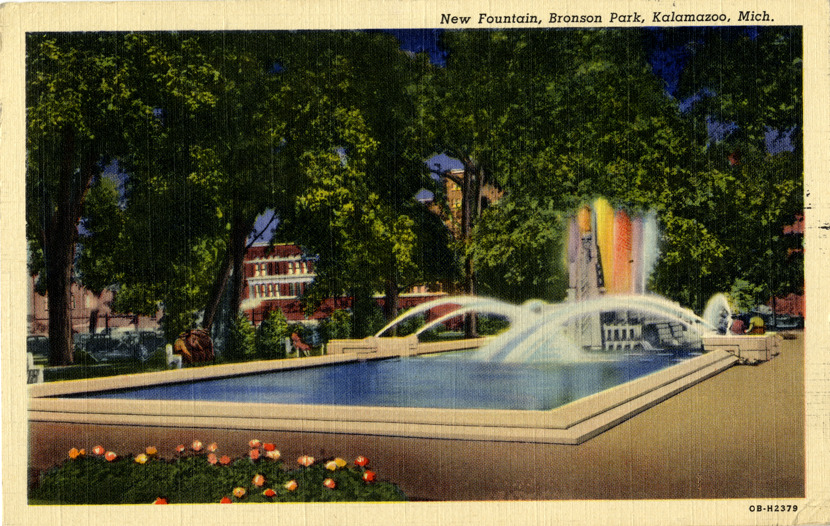Nighttime view of the fountain at Bronson Park in Kalamazoo, Michigan. Printed on front: "New fountain, Bronson Park, Kalamazoo, Mich." Printed on back: "Distributed by Lloyd Smith, Kalamazoo, Mich. Genuine Curteich-Chicago 'C.T. Art-Colortone' post card (reg. U.S. Pat. Off.)" Handwritten on back: "Dear Mary & folks at home. Arrived safely yesterday. Nice & cool here. Della Chas. & I are having a good visit. Hope you had a nice rain like we did here. Just had dinner, and am sending out cards to folks & all. Hope you are all well. Della joins me in sending love. Yours truly, Lyda Fielding." Card is postmarked July 13, 1944.