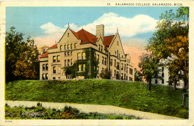 View of Kalamazoo College in Kalamazoo, Michigan. Printed on front: "15. Kalamazoo College, Kalamazoo, Mich." Printed on back: "Published by Harry H. Hamm, Toledo, Ohio. H.H. Hamm, Toledo, Ohio. Commercial Colortype Company, Chicago." Handwritten on back: "Dear Father, Just a word of cheer from a friend a long way from home but with thoughts always of those we made friends with. Sincerely, F.J. [undecipherable]. Jamaica, N.Y." Card is postmarked January 21, 1927.