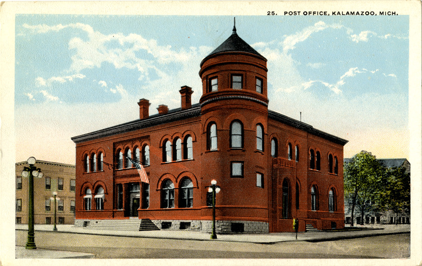 View of the U.S. Post Office in Kalamazoo, Michigan. Printed on front: "25. Post Office, Kalamazoo, Mich." Printed on back: "Published by M.E. [sic] Hamm, Toledo, Ohio. Made in U.S.A. H.H. Hamm, Toledo, Ohio."