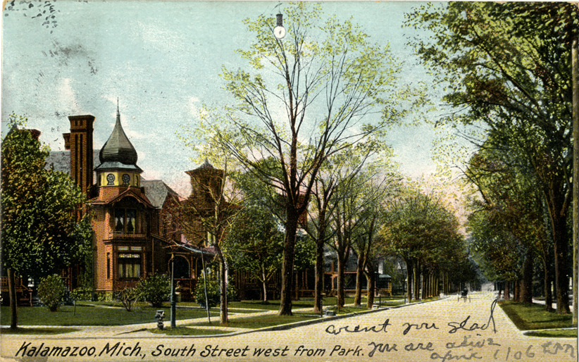 View of houses on tree-lined South St. in Kalamazoo, Michigan. Printed on front: "Kalamazoo, Mich. South Street west from Park." Handwritten on front: "Aren't you glad you are alive. April 1/06." Printed on back: "The H.C. Leighton Co., Portland, Me., Manufacturers of postal cards. Made in Germany no. 1830." Card is postmarked March 31, 1906.
