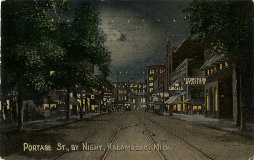 Nighttime view of commercial buildings on Portage St. in Kalamazoo, Michigan. Printed on front: "Portage St. by night, Kalamazoo, Mich." Handwritten on back: "Kalamazoo, Friday. How do you do? Came here yesterday. So back to B.C. today to Marshall the first of the week probably Tuesday. Send [undecipherable] in care of Clara. Hope to hear from you today that you are coming [undecipherable]." Card is postmarked April 23, 1915.