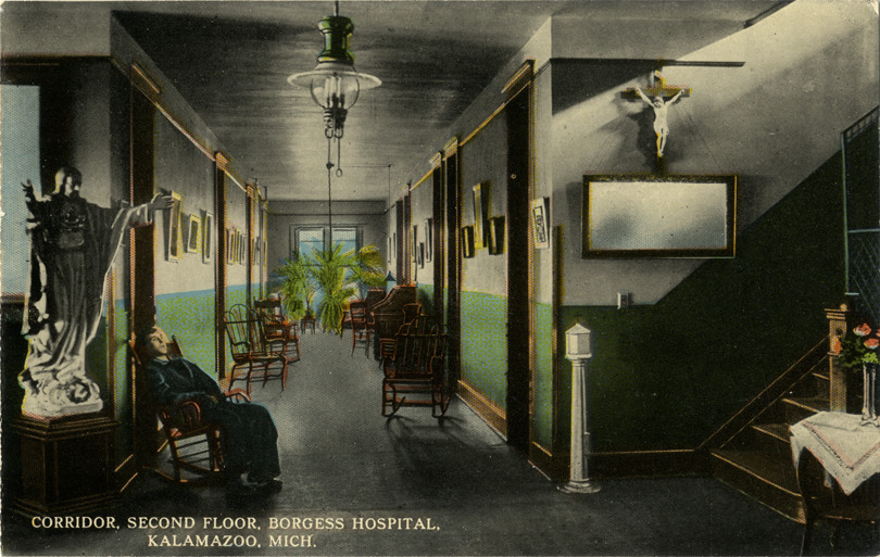 View of the second floor hallway in Borgess Hospital at Kalamazoo, Michigan. Chairs are lined up in hall; man sits in chair in foreground. Statue on left; staircase on right. Printed on front: "Corridor, second floor. Borgess Hospital, Kalamazoo, Mich." Printed on back: "Hermann Post Card Co., 217 Pine St., St. Louis, Mo."