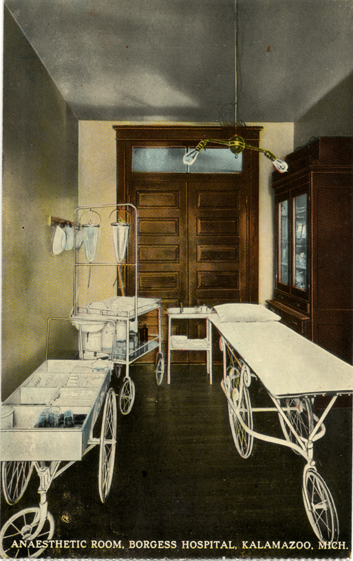 View of the Anaesthetic Room at Borgess Hospital in Kalamazoo, Michigan. Room is furnished with gurney and equipment carts. Printed on front: "Anaesthetic Room, Borgess Hospital, Kalamazoo, Mich." Printed on back: "Hermann Post Card Co., 217 Pine St., St. Louis, Mo."