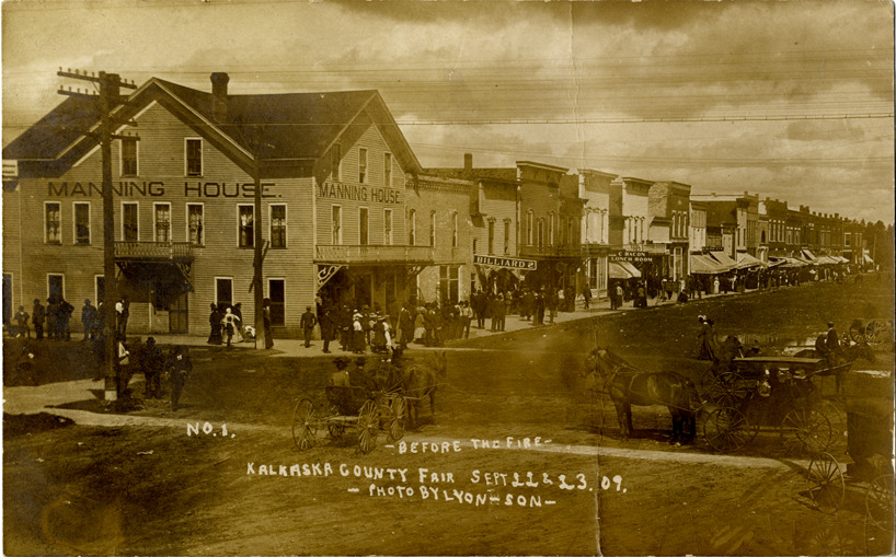 View of commercial buildings and horse-drawn vehicles on street in Kalkaska, Michigan. Printed on front: "No. 1. Before the fire. Kalkaska County Fair, Sept. 22 & 23, 09. Photo by Lyon - Son." Handwritten on back: "Friend Roscoe, I got here all right but it has rained most of the time since I came am well pleased with the place. F.A. Bennetts [undecipherable]." Card is postmarked June 14, 1910.