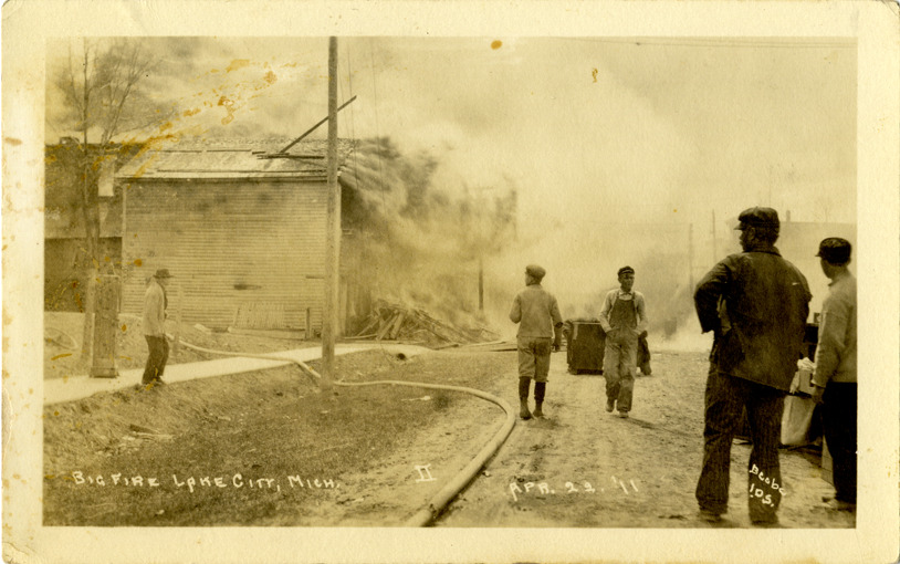 View of onlookers watching building fire at Lake City, Michigan. Hose in foreground. Printed on front: "Big fire, Lake City, Mich. Apr. 22, '11. II. Beebe, I.D.S." Handwritten on back: "Lake City fire."