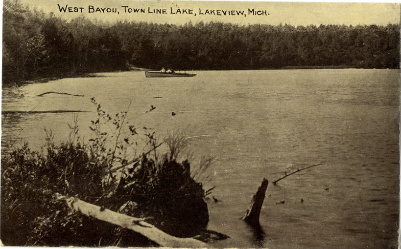 View of a rowboat on West Bayou at Town Line Lake in Lakeview, Michigan. Printed on front: "West Bayou, Town Line Lake, Lakeview, Mich." Printed on back: "Pub. by C.W. Vining, Lakeview, Mich. Series 173." Handwritten on back: "Sep 12. Dear Lila, We are going up to our farm Tue. to put up grain will be gone a wk our neighbor & wife are going the same ones that went when we bought it. We probably will go up home while there its only 7 1/2 mi from there 12 mi nearer than we are now. We have been invited to go to Greenville tomorrow for auto ride. Lottie."