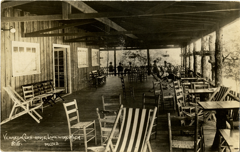 View of chairs on veranda of clubhouse at Lakewood, Michigan. Printed on front: "Veranda, club-house, Lakewood, Mich." Printed on back: "National Photo Co., Minneapolis, Minn."