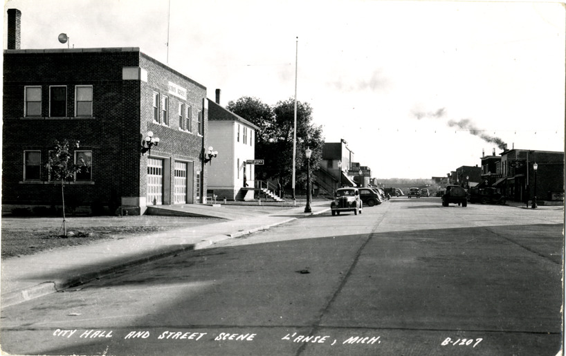 View of the City Hall and U.S. Post Office at L'Anse, Michigan. Automobiles in background. Printed on front: "City Hall and street scene, L'Anse, Mich." Printed on back: "All rights reserved. The L.L. Cook Co., Milwaukee."