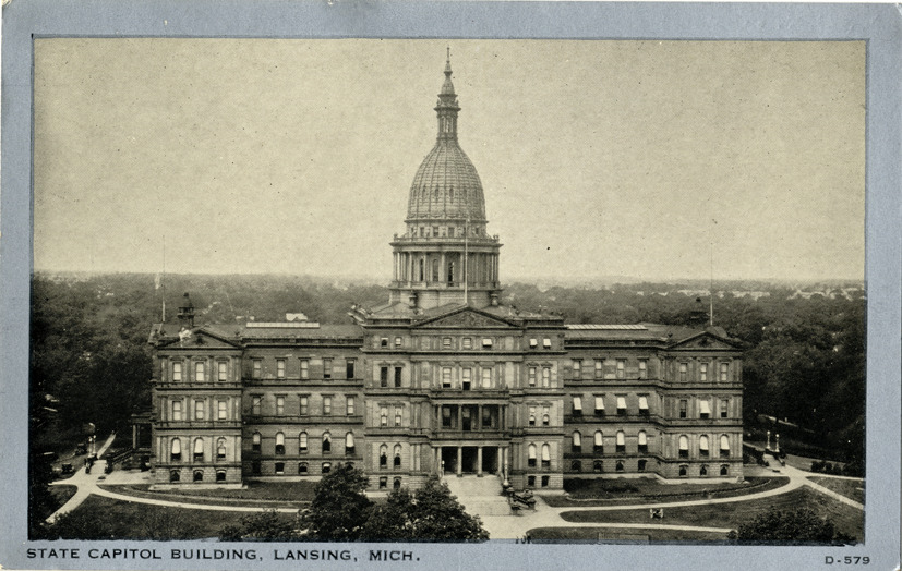 View of the Michigan State Capitol building in Lansing, Michigan. Printed on front: "State Capitol building, Lansing, Mich." Printed on back: "Mfd. by Wayne Paper Box & Prtg. Corp., Fort Wayne, Ind."