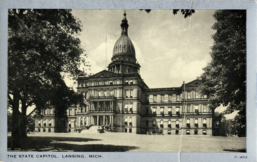 Favorite this☆ Michigan State Capitol, Lansing, Michigan Description: View of the Michigan State Capitol building in Lansing, Michigan. Printed on front: "State Capitol building, Lansing, Mich." Printed on back: "Mfd. by Wayne Paper Box & Prtg. Corp., Fort Wayne, Ind." Details Resource ID: bh015355 Subject: Michigan State Capitol (Lansing, Mich.) Postcards Date Issued: Unknown year Format: 1 postcard ; 3.5 x 5.5 in. Member of: Burton Historical Collection Filing Location: M/Localities-Lansing Rights: Physical rights are retained by DPL. Copyright is retained in accordance with U.S. copyright laws.