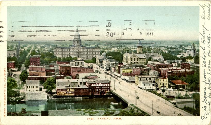 Bird's-eye view of Lansing, Michigan. Printed on front: "7542. Lansing, Mich. Detroit Photographic Co., publishers." Handwritten on front: "S is home from school today, sick. Guess he will soon be well. Emily." Card is postmarked January 5, 1905.