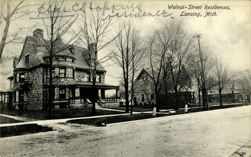 View of the Charles C. Hopkins residence and other houses on Walnut St. in Lansing, Michigan. Printed on front: "Walnut Street residences. Lansing, Mich." Handwritten on front: "Chas. C. Hopkins residence." Printed on back: "Published exclusively for S.H. Knox & Co. Made in Germany."