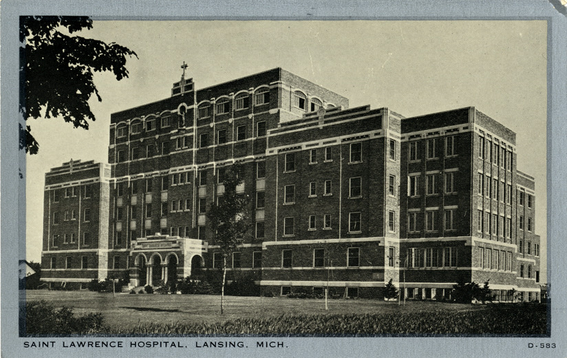 Favorite this☆ St. Lawrence Hospital, Lansing, Michigan Description: View of St. Lawrence Hospital in Lansing, Michigan. Printed on front: "Saint Lawrence Hospital, Lansing, Mich." Printed on back: "Mfd. by Wayne Paper Box & Prtg. Corp., Fort Wayne, Ind." Details Resource ID: bh015395 Subject: Hospital buildings--Michigan--Lansing Postcards Date Issued: Unknown year Format: 1 postcard ; 3.5 x 5.5 in. Member of: Burton Historical Collection Filing Location: M/Localities-Lansing Rights: Physical rights are retained by DPL. Copyright is retained in accordance with U.S. copyright laws.