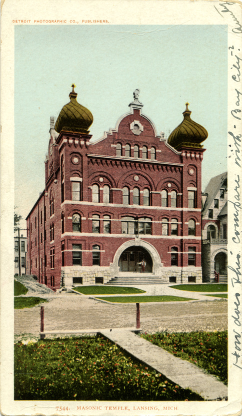 Favorite this☆ Masonic Temple, Lansing, Michigan Description: View of the Masonic Temple in Lansing, Michigan. Printed on front: "7544. Masonic Temple, Lansing, Mich. Detroit Photographic Co., publishers." Handwritten on front: "How does this compare with Bay City? Aunty." Card is postmarked January 4, 1905. Details Resource ID: bh015397 Subject: Masonic Temple (Lansing, Mich.) Postcards Publisher: Detroit Photographic Co. Date Issued: 1905 (year approximate) Format: 1 postcard : col. ; 5.5 x 3.25 in. Member of: Burton Historical Collection Filing Location: M/Localities-Lansing Rights: Physical rights are retained by DPL. Copyright is retained in accordance with U.S. copyright laws.