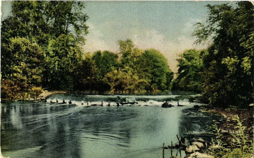 View of the dam on the Cedar River in Lansing, Michigan. Printed on back: "Z-46. Dam, Cedar River, near the M.A.C., Lansing, Mich." Handwritten on back: "Dear Lina, What about that delayed visit? Can you come now? Fredrika writes she saw Ward in Chicago. Love to you all, Della." Card is postmarked May 14, 1911.
