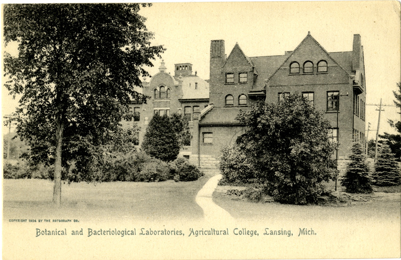 View of the Botanical and Bacteriological Laboratories at Michigan Agricultural College in East Lansing, Michigan. Printed on front: "Botanical and Bacteriological Laboratories, Michigan Agricultural College, Lansing, Mich. Copyright 1904 by the Rotograph Co." Printed on back: "No. 3796. The Rotograph Co., N.Y., City, (Germany)."