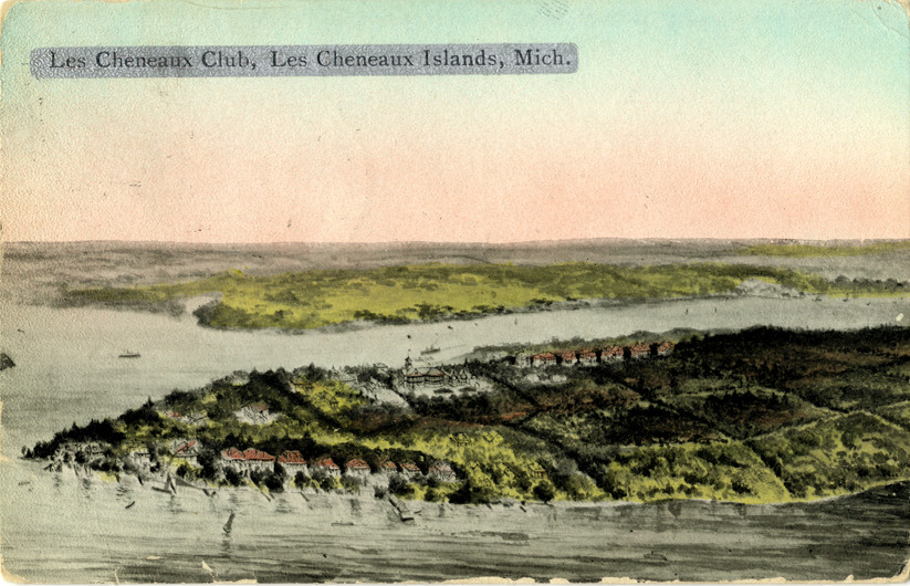 Bird's-eye view of the Les Cheneaux Club at the Les Cheneaux Islands, Michigan. Printed on front: "Les Cheneaux Club, Les Cheneaux Islands, Mich." Printed on back: "Pub. by Barnes Crosby Co., Chicago and Milwaukee." Handwritten on back: "Dear Mother, We are having a grand time. I do hope you are feeling better & Lee is taking good care of you the air here is fine. Lina." Card is postmarked August 27, 1913.