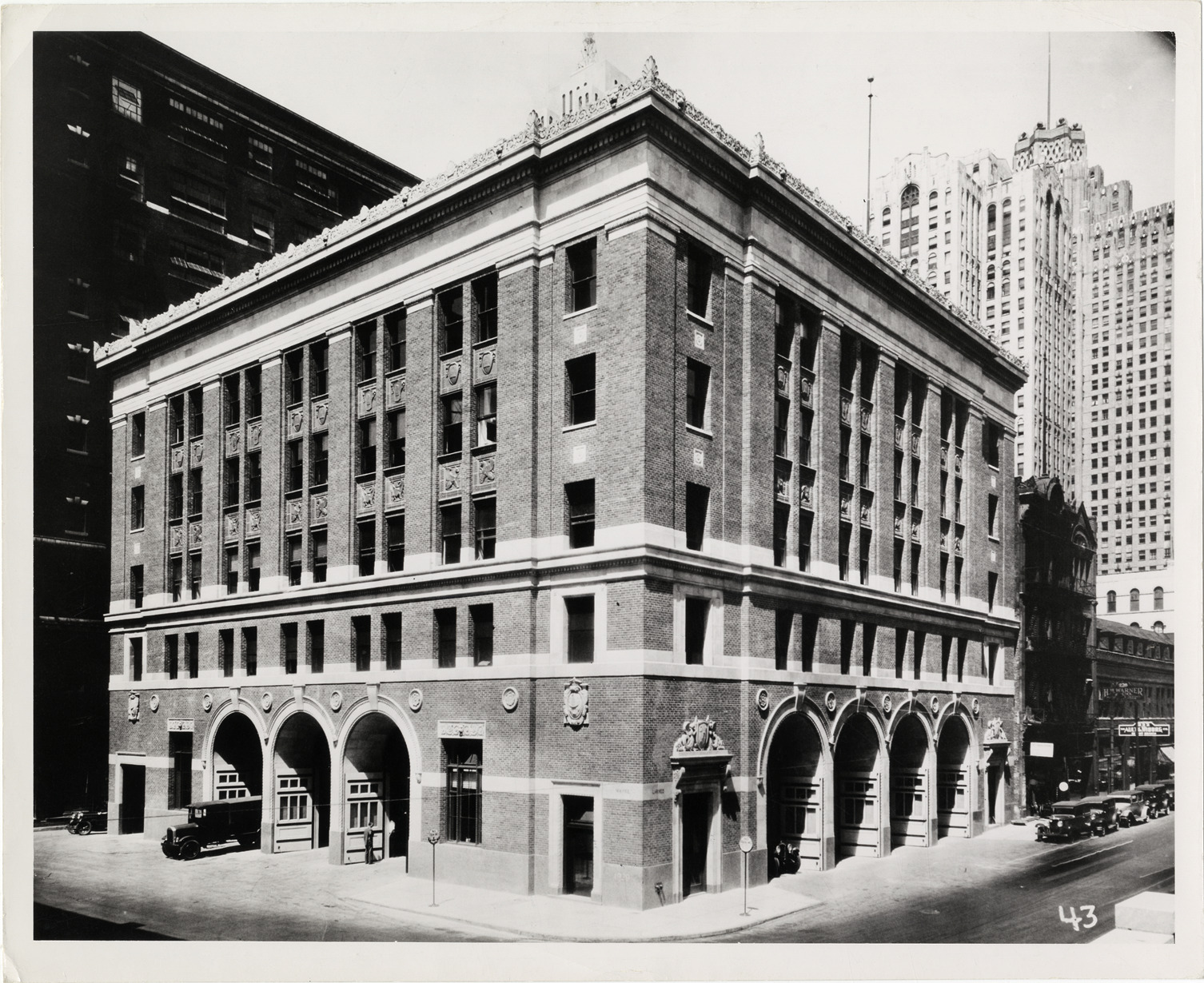 View of the Detroit Fire Department headquarters, located on the corner of Larned and Washington Boulevard. Building was designed by Hans Gehrke. Office buildings in background. Handwritten on back: "Fire headquarters on E. cor. Larned and Wayne [sic], built 1929."