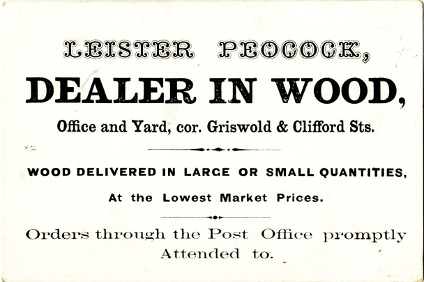 View of a business card for Leister Peocock. Printed on front: "Leister Peocock, dealer in wood, office and yard, cor. Griswold & Clifford Sts. Wood delivered in large or small quantities at the lowest market price. Orders through the Post Office promptly attended to."