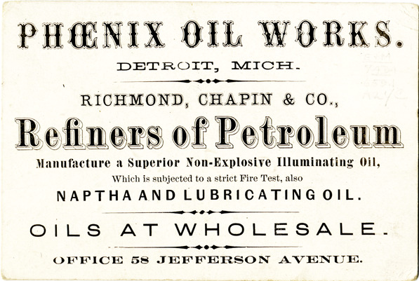 View of a business card for Phoenix Oil Works. Printed on front: "Phoenix Oil Works. Detroit, Mich. Richmond, Chapin & Co., refiners of petroleum. Manufacture a superior non-explosive illuminating oil, which is subjected to a strict fire test, also naptha and lubricating oil. Oils at wholesale. Office, 58 Jefferson Avenue."