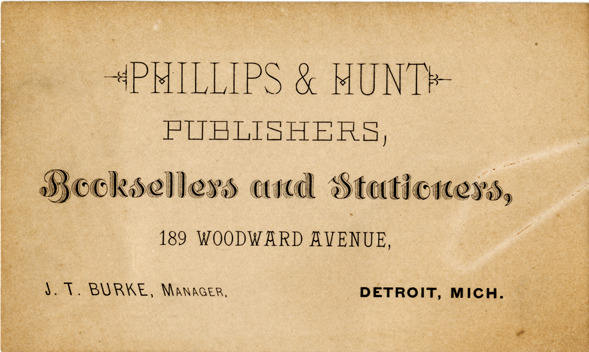Favorite this☆ Business card for Phillips & Hunt Description: View of a business card for Phillips & Hunt. Printed on front: "Phillips & Hunt, publishers, booksellers and stationers. 189 Woodward Avenue, Detroit, Mich. J.T. Burke, manager." Details Resource ID: bh015536 Subject: Booksellers--Michigan--Detroit Stationery trade--Michigan--Detroit Business cards Date Issued: Unknown year Format: 1 business card ; 2.5 x 4 in. Member of: Burton Historical Collection Filing Location: E&M 977.4D4 381 P Rights: Physical rights are retained by DPL. Copyright is retained in accordance with U.S. copyright laws.