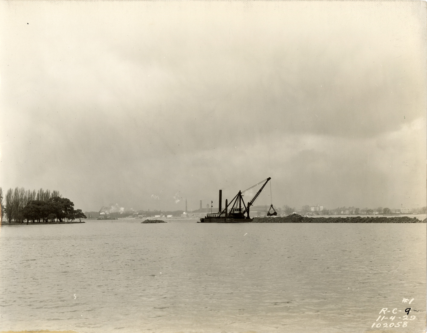 View of a crane depositing rock on dike at the intake lagoon for the Detroit water supply system. Printed on front: "#1, R-C-9. 11-4-29. 102058." Stamped on back: "Manning Bros., commercial photographers. 504-505 Lincoln Building. Corner State and Park Sts., Detroit, Mich." Typed on back: "Additional water supply. Intake system. Intake lagoon, Contract RC-9. Placing rock in dike on river side of downstream end of intake lagoon."