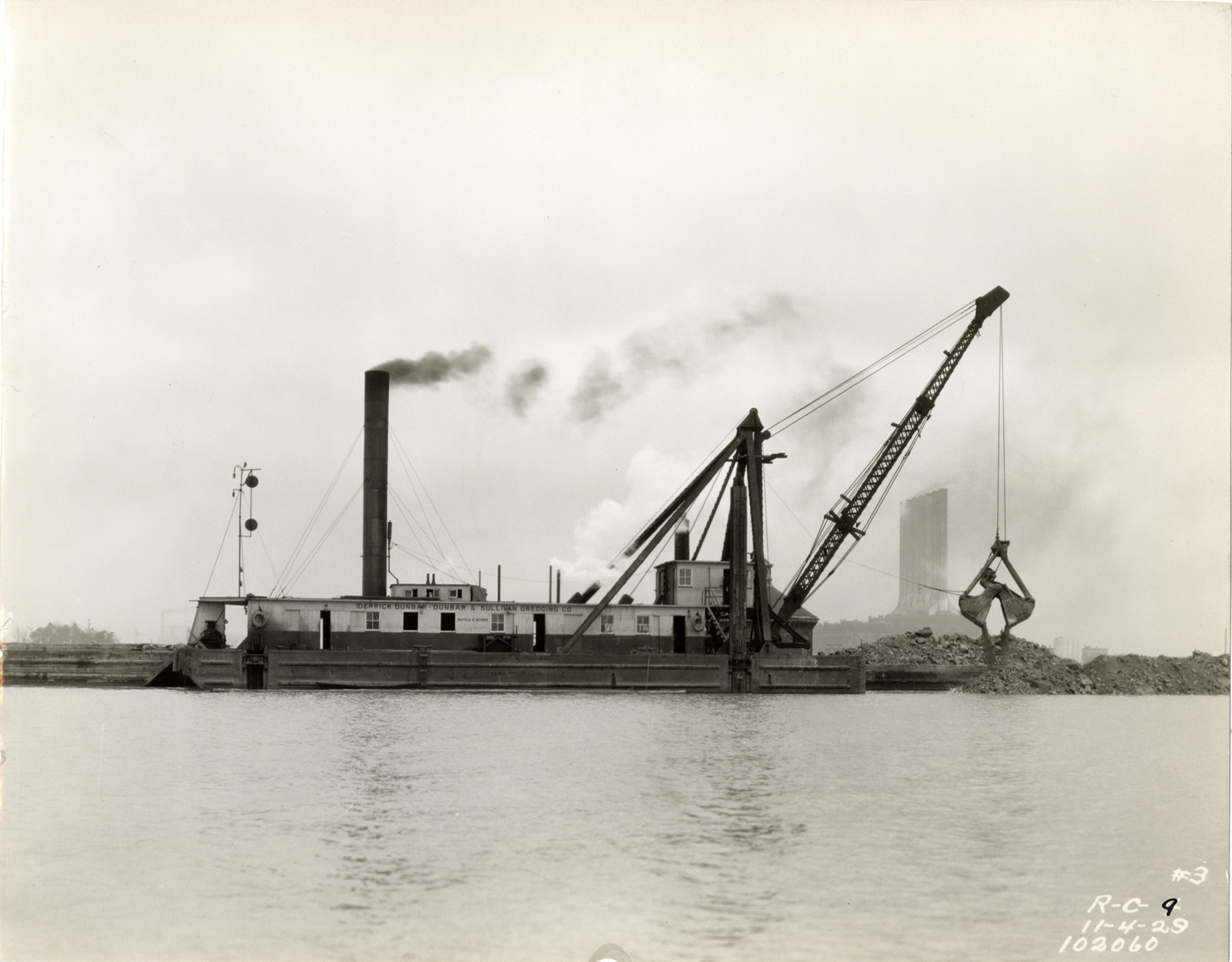 View of a crane depositing rock on dike at the intake lagoon for the Detroit water supply system. Printed on front: "#3, R-C-9. 11-4-29. 102060." Stamped on back: "Manning Bros., commercial photographers. 504-505 Lincoln Building. Corner State and Park Sts., Detroit, Mich." Typed on back: "Additional water supply. Intake system. Intake lagoon, Contract RC-9. Placing rock in dike on river side of downstream end of intake lagoon."
