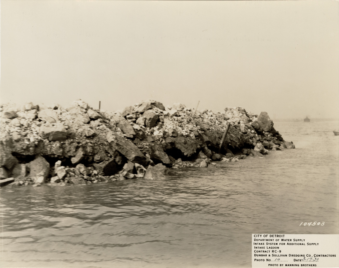 View of dike at intake lagoon for the Detroit water supply system. Printed on front: "City of Detroit. Department of Water Supply. Intake system for additional supply. Intake lagoon. Contract RC-9. Dunbar & Sullivan Dredging Co., contractors. Photo no. 10. Date: 3-17-30. Photo by Manning Brothers." Typed on back: "Rock dike at tip of dike enclosing upper end of lagoon. Sta. 38 + 00, 60 ft. north. view looking downstream. Note undercutting at water level."