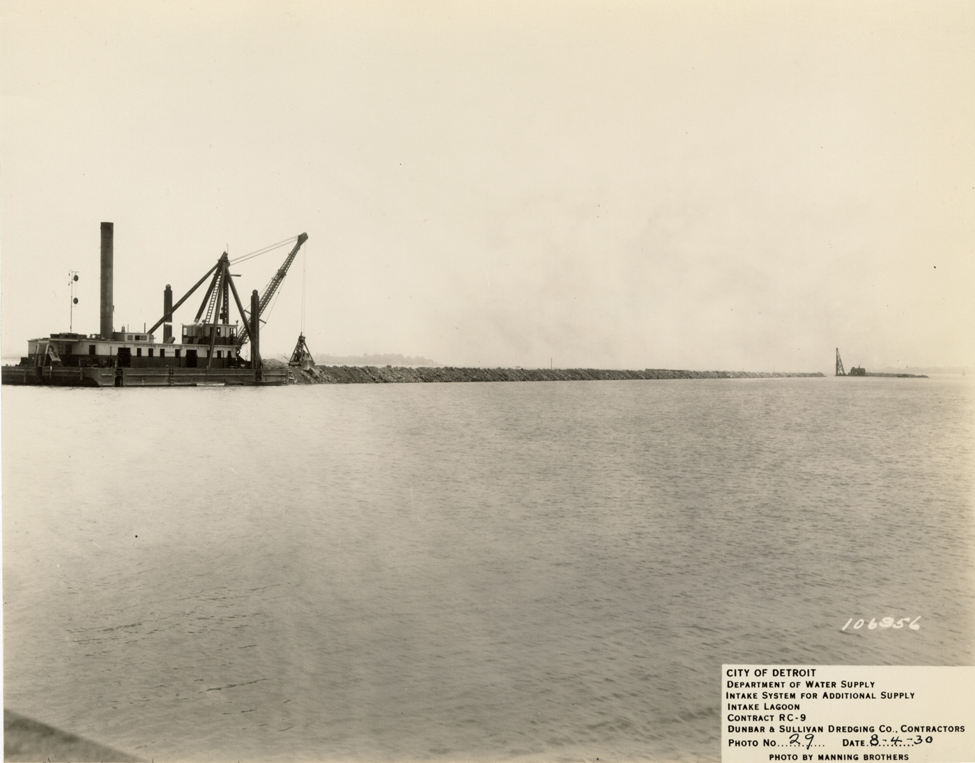 View of crane from Dunbar & Sullivan Dredging Co. placing rock on north dike at intake lagoon for the Detroit water supply system. Printed on front: "City of Detroit. Department of Water Supply. Intake system for additional supply. Intake lagoon. Contract RC-9. Dunbar & Sullivan Dredging Co., contractors. Photo no. 29. Date: 8-4-30. Photo by Manning Brothers." Typed on back: "Placing rock in north dike of lagoon. Derrick at right driving steel sheet piling for cells at entrance to lagoon."
