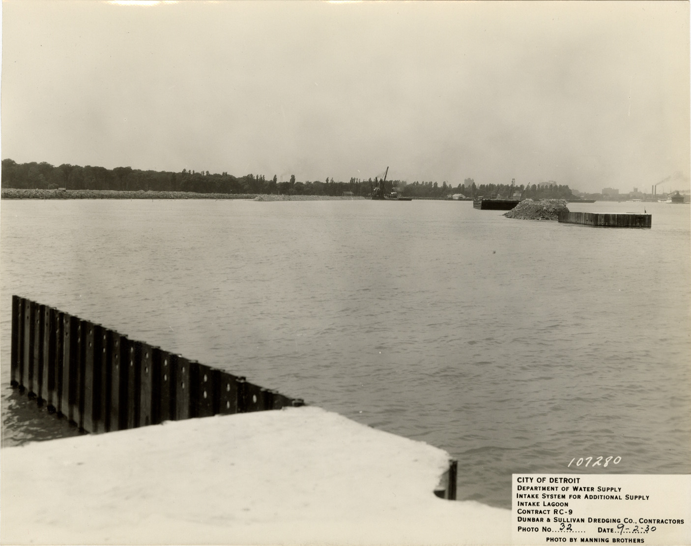 View of concrete piers in intake lagoon for the Detroit water supply system. Printed on front: "City of Detroit. Department of Water Supply. Intake system for additional supply. Intake lagoon. Contract RC-9. Dunbar & Sullivan Dredging Co., contractors. Photo no. 32. Date: 9-2-30. Photo by Manning Brothers." Typed on back: "Entrance to intake lagoon showing the two concrete piers."