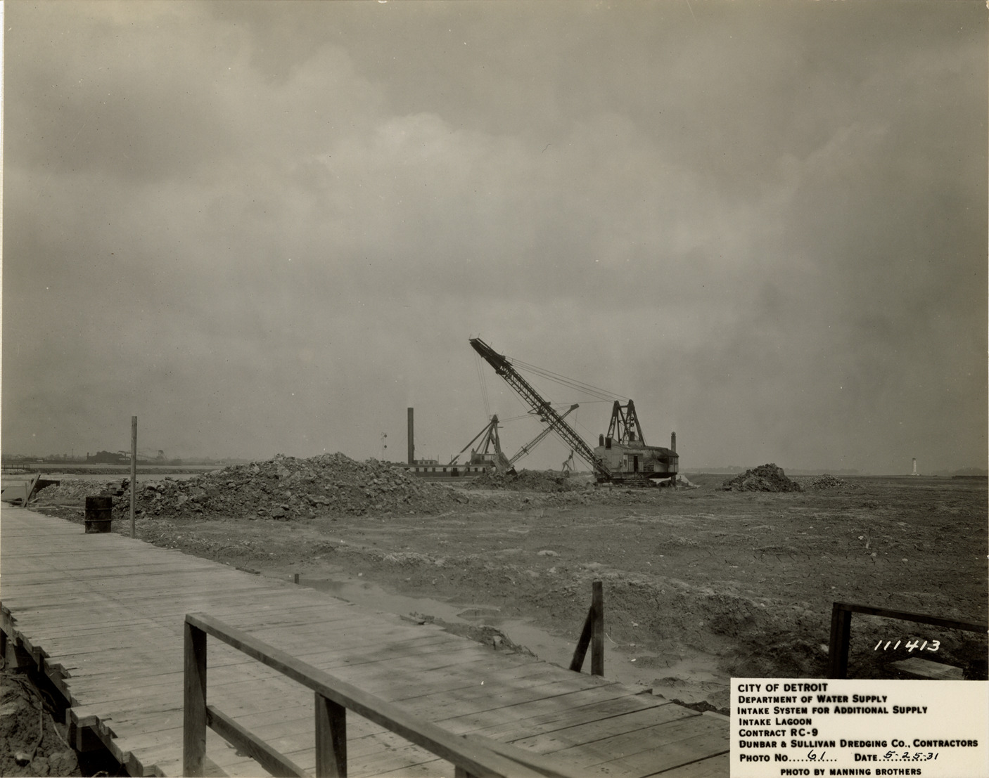 View of the derrick boat "Dunbar" and a dragline excavator trimming back channel and building embankment for the Detroit water supply system. Printed on front: "City of Detroit. Department of Water Supply. Intake system for additional supply. Intake lagoon. Contract RC-9. Dunbar & Sullivan Dredging Co., contractors. Photo no. 61. Date: 5-25-31. Photo by Manning Brothers." Typed on back: "Drag line trimming back channel and placing earth fill along south dike of intake lagoon, between access trestle and inlet to middle bridge. View looking easterly from access trestle showing derrick boat "Dunbar" and dragline Cuilene Rhue building embankment to north of back channel."