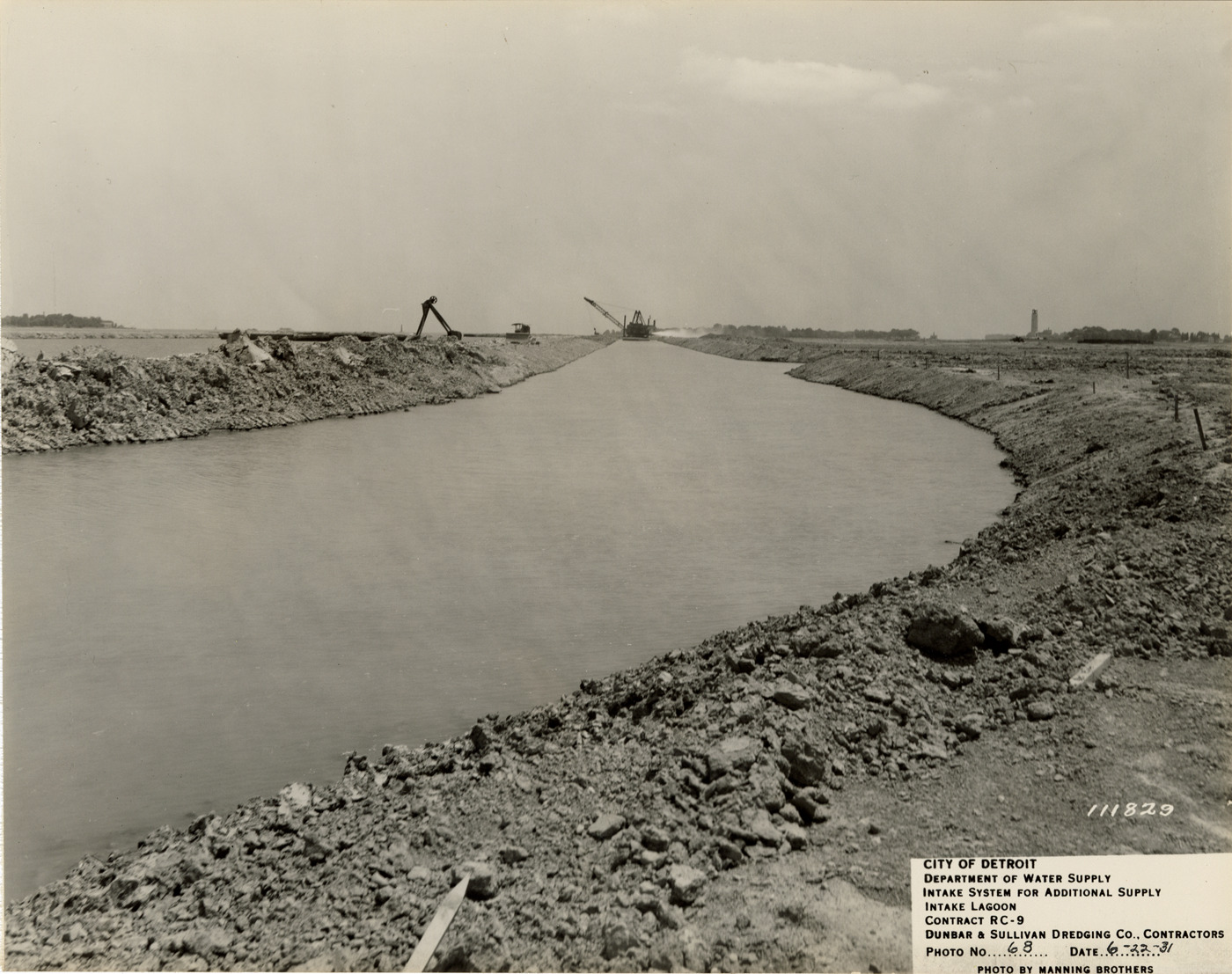 View of back channel for the Detroit water supply system. Printed on front: "City of Detroit. Department of Water Supply. Intake system for additional supply. Intake lagoon. Contract RC-9. Dunbar & Sullivan Dredging Co., contractors. Photo no. 68. Date: 6-22-31. Photo by Manning Brothers." Typed on back: "Back channel, looking easterly from Sta. 12."