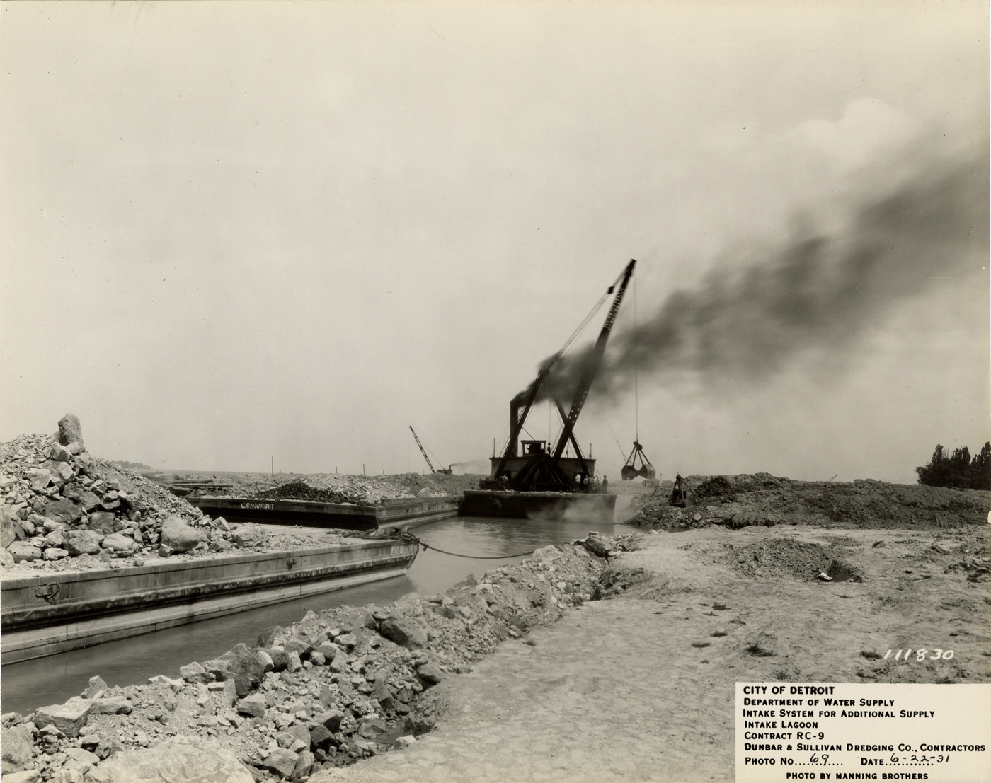 View of derrick boat "D-1" depositing rock for shore protection at the back channel for the Detroit water supply system. Printed on front: "City of Detroit. Department of Water Supply. Intake system for additional supply. Intake lagoon. Contract RC-9. Dunbar & Sullivan Dredging Co., contractors. Photo no. 69. Date: 6-22-31. Photo by Manning Brothers." Typed on back: "Derrick boat "D-1" placing Livingstone Channel rock for shore protection along lower end of back channel, near Sta. 1 + 00."