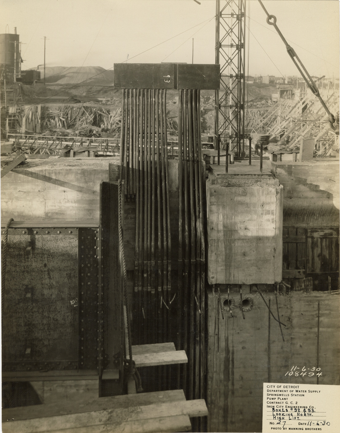 View of electrical boxes no. 92 and no. 93 of the Springwells Station pump plant during construction, Detroit water supply system. Printed on front: "City of Detroit. Department of Water Supply. Springwells Station pump plant. Contract G.C. 2. Iron City Engineering Co. Boxes #92 & #93. Looking north. High lift. No. 27. Date: 11-6-30. Photo by Manning Brothers."