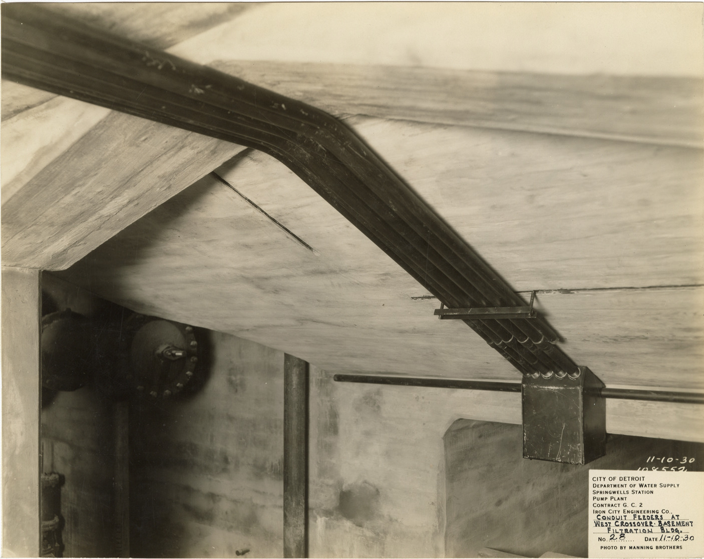 View of conduit feeders in the Filtration Building of the Springwells Station pump plant during construction, Detroit water supply system. Printed on front: "City of Detroit. Department of Water Supply. Springwells Station pump plant. Contract G.C. 2. Iron City Engineering Co. Conduit feeders at west crossover, basement, Filtration Bldg. No. 28. Date: 11-10-30. Photo by Manning Brothers." Handwritten on back: "Circuit feeders from Pump Room at west walkway crossover. Filtration Bldg."