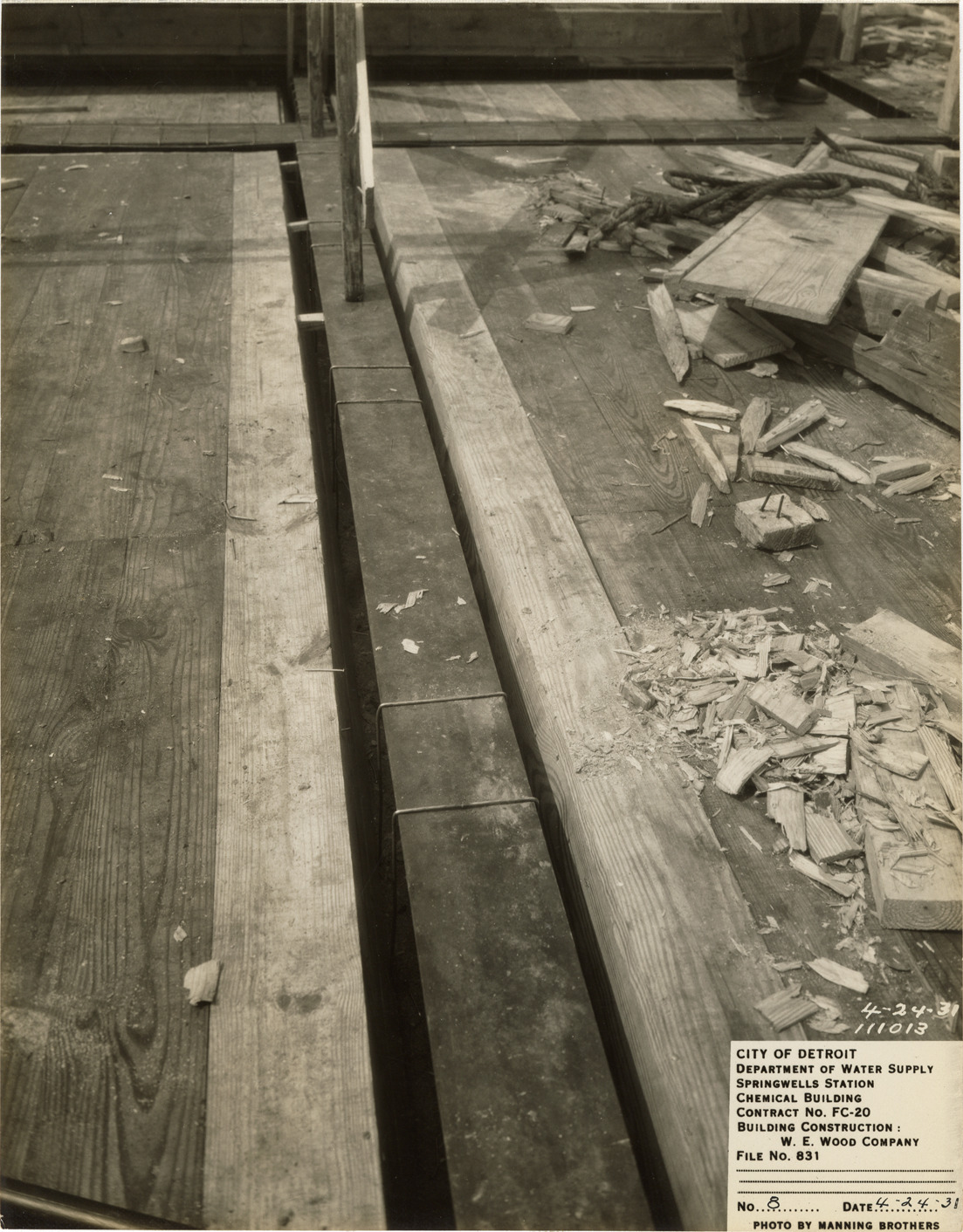 View of floor and beam forms for top floor of Chemical Building in the Springwells Station treatment plant during construction, Detroit water supply system. Printed on front: "City of Detroit. Department of Water Supply. Springwells Station. Chemical Building. Contract No. FC-20. Building construction: W.E. Wood Company. File no. 831. No. 8. Date: 4-24-31. Photo by Manning Brothers." Typed on back: "Floor and beam forms for top floor of Chemical Building."