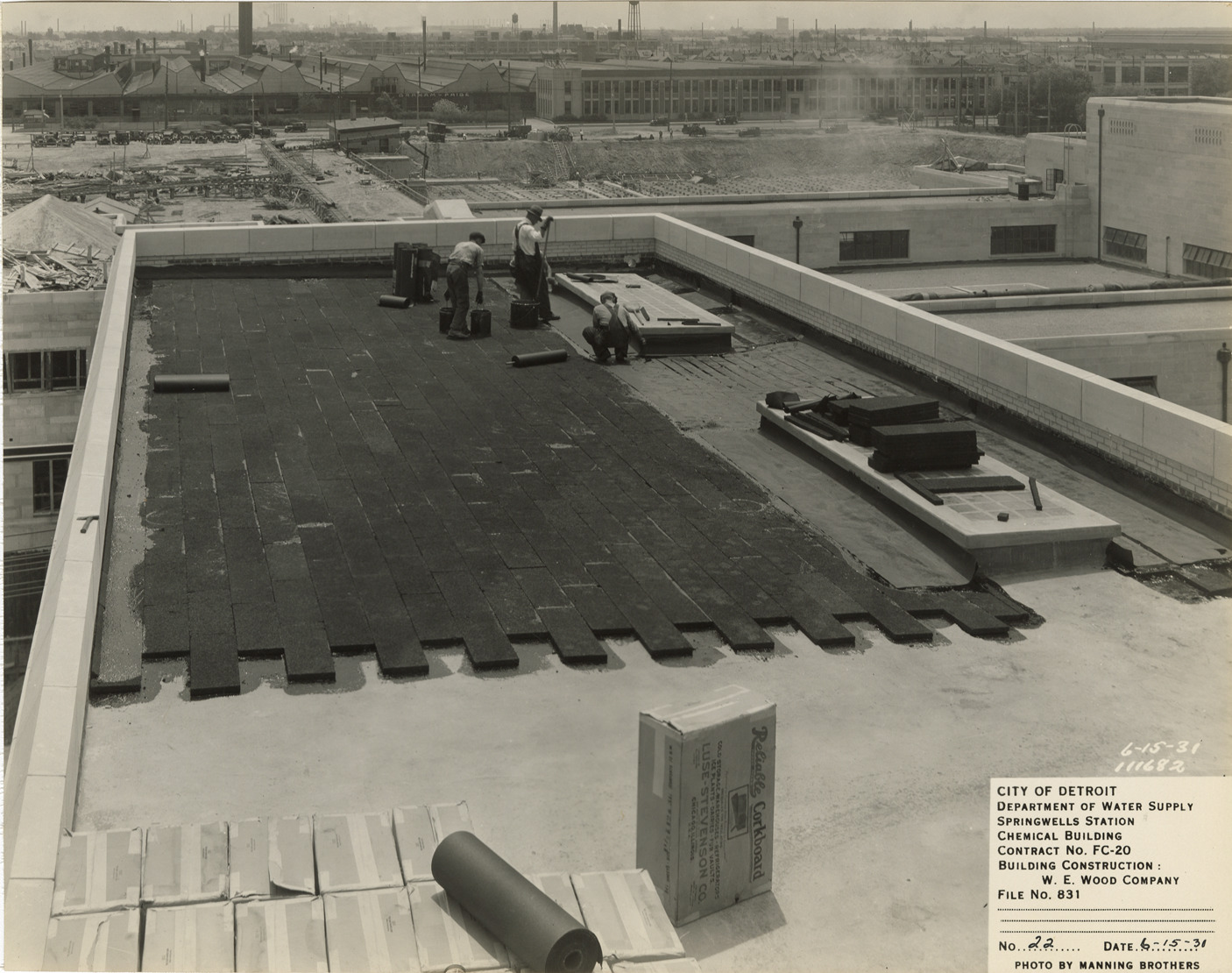 View of men doing roof construction at the Chemical Building in the Springwells Station treatment plant, Detroit water supply system. Printed on front: "City of Detroit. Department of Water Supply. Springwells Station. Chemical Building. Contract No. FC-20. Building construction: W.E. Wood Company. File no. 831. No. 22. Date: 6-15-31. Photo by Manning Brothers." Typed on back: "Installing roof, south side of Chemical Building."