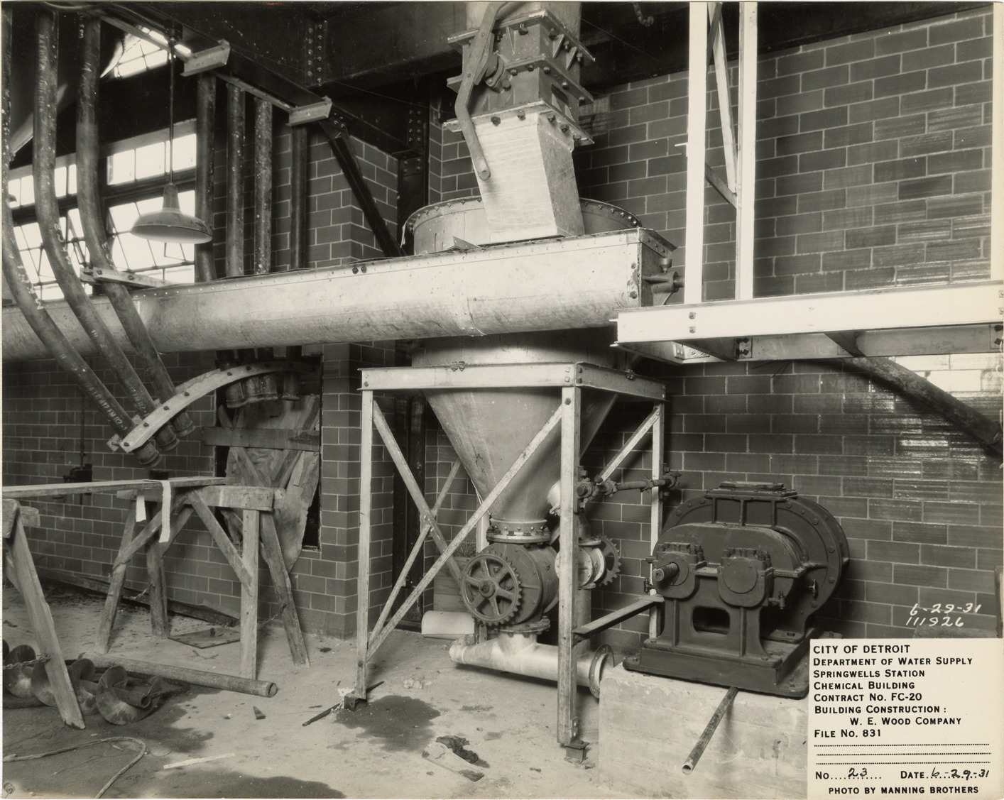 View of alum conveying equipment at the Chemical Building in the Springwells Station treatment plant during construction, Detroit water supply system. Printed on front: "City of Detroit. Department of Water Supply. Springwells Station. Chemical Building. Contract No. FC-20. Building construction: W.E. Wood Company. File no. 831. No. 23. Date: 6-29-31. Photo by Manning Brothers." Typed on back: "Alum conveying equipment at north end of Chemical Building."