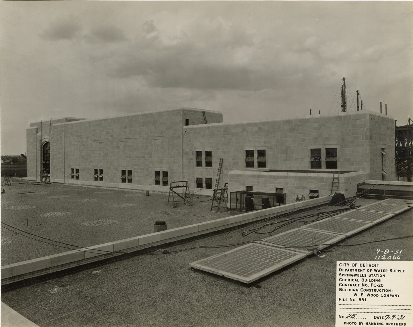 View of the Chemical Building in the Springwells Station treatment plant during construction, Detroit water supply system. Printed on front: "City of Detroit. Department of Water Supply. Springwells Station. Chemical Building. Contract No. FC-20. Building construction: W.E. Wood Company. File no. 831. No. 25. Date: 7-9-31. Photo by Manning Brothers." Typed on back: "West elevation of Chemical Building, looking northeast from roof of filter plant."