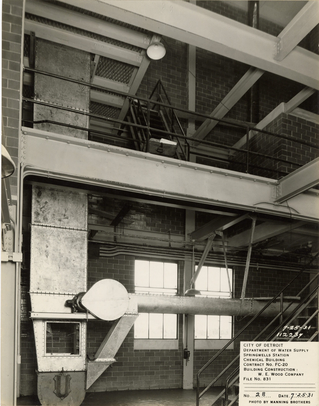 View of an alum elevator at Chemical Building in the Springwells Station treatment plant during construction, Detroit water supply system. Printed on front: "City of Detroit. Department of Water Supply. Springwells Station. Chemical Building. Contract No. FC-20. Building construction: W.E. Wood Company. File no. 831. No. 28. Date: 7-25-31. Photo by Manning Brothers." Typed on back: "Alum elevator at about middle of building. View looking west."