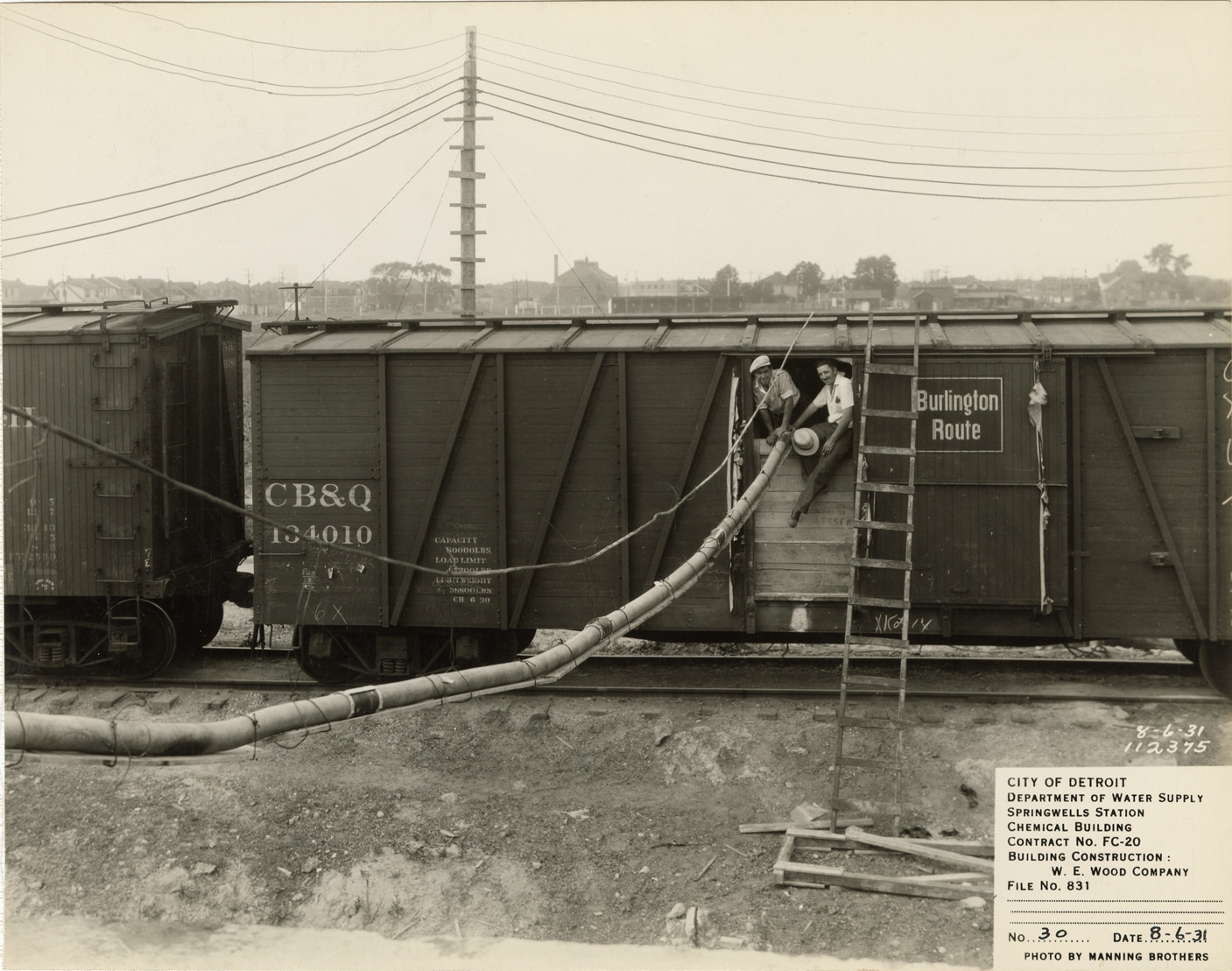 View of two men unloading alum, via a hose, from a railroad freight car during the construction of the Chemical Building in the Springwells Station treatment plant, Detroit water supply system. Printed on front: "City of Detroit. Department of Water Supply. Springwells Station. Chemical Building. Contract No. FC-20. Building construction: W.E. Wood Company. File no. 831. No. 30. Date: 8-6-31. Photo by Manning Brothers." Typed on back: "Unloading first car of alum; air hose suspended from cable."