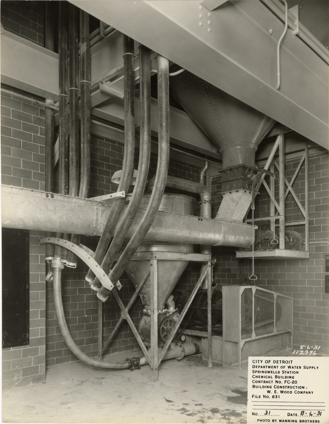 View of air conveying equipment at the Chemical Building in the Springwells Station treatment plant during construction, Detroit water supply system. Printed on front: "City of Detroit. Department of Water Supply. Springwells Station. Chemical Building. Contract No. FC-20. Building construction: W.E. Wood Company. File no. 831. No. 31. Date: 8-6-31. Photo by Manning Brothers." Typed on back: "Air conveying equipment at north end of Chemical Building."