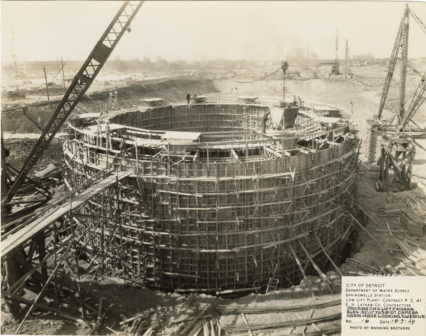 View of low lift plant in the Springwells Station treatment plant during construction, Detroit water supply system. Printed on front: "City of Detroit. Department of Water Supply. Springwells Station. Low lift plant. Contract P.C. 41. E.C. Latham Co., contractors. Pouring 2nd lift caisson. Elev. 32'-11" to 59'-0". Camera 1160N 1480E looking S.W. & down. No. 16. Date: 10-7-29. Photo by Manning Brothers."