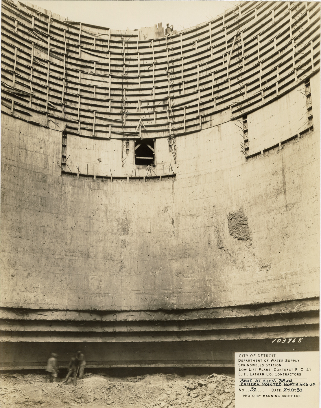 View of workers at the low lift plant in the Springwells Station treatment plant during construction, Detroit water supply system. Printed on front: "City of Detroit. Department of Water Supply. Springwells Station. Low lift plant. Contract P.C. 41. E.C. Latham Co., contractors. Shoe at elev. 38.02, camera pointed north and up. No. 32. Date: 2-10-30. Photo by Manning Brothers."