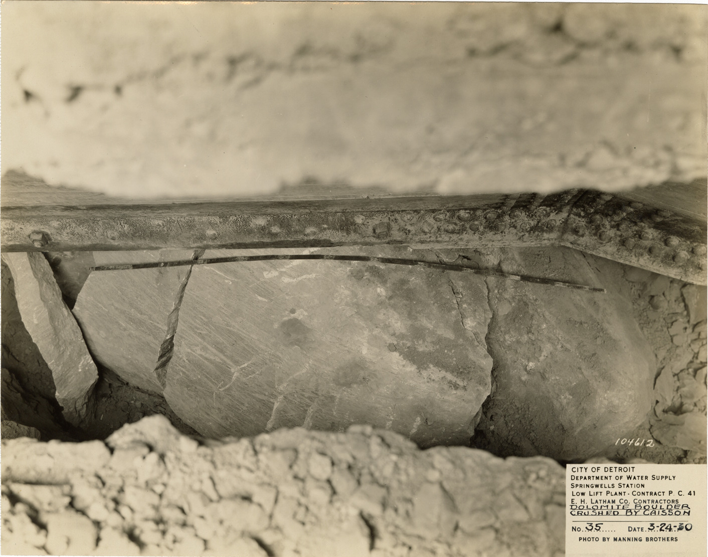 View of a dolomite boulder crushed by caisson at the low lift plant in the Springwells Station treatment plant during construction, Detroit water supply system. Printed on front: "City of Detroit. Department of Water Supply. Springwells Station. Low lift plant. Contract P.C. 41. E.C. Latham Co., contractors. Dolomite boulder crushed by caisson. No. 35. Date: 3-24-30. Photo by Manning Brothers."