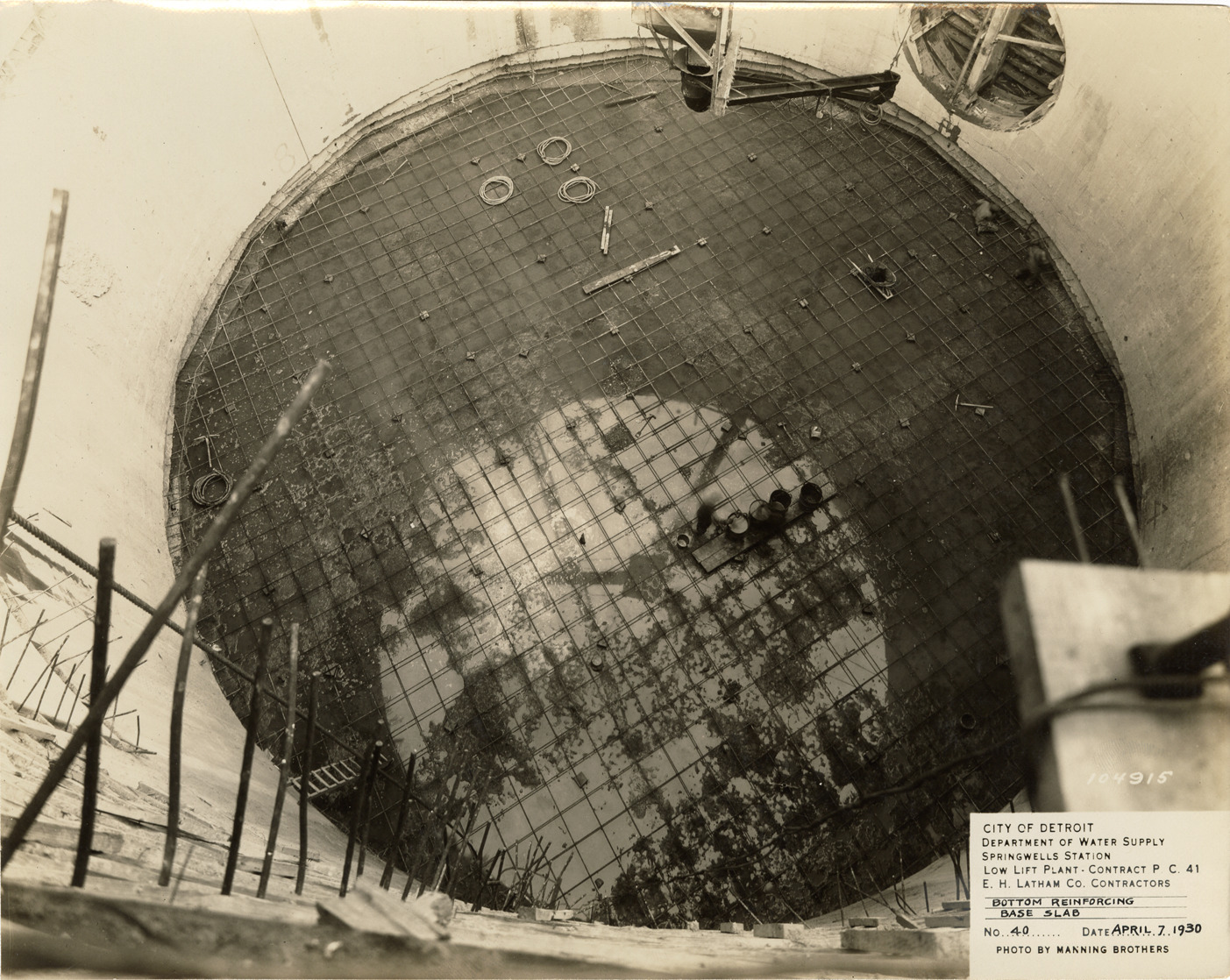View of bottom reinforcing base slab at low lift plant in the Springwells Station treatment plant during construction, Detroit water supply system. Printed on front: "City of Detroit. Department of Water Supply. Springwells Station. Low lift plant. Contract P.C. 41. E.C. Latham Co., contractors. Bottom reinforcing base slab. No. 40. Date: April 7, 1930. Photo by Manning Brothers."
