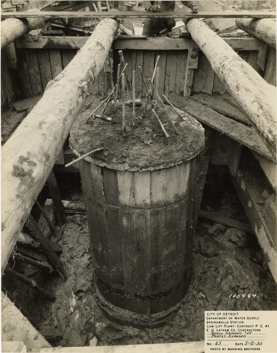 View of caisson at low lift plant in the Springwells Station treatment plant during construction, Detroit water supply system. Printed on front: "City of Detroit. Department of Water Supply. Springwells Station. Low lift plant. Contract P.C. 41. E.C. Latham Co., contractors. Small caisson #25, partially exposed. No. 45. Date: 5-8-30. Photo by Manning Brothers."