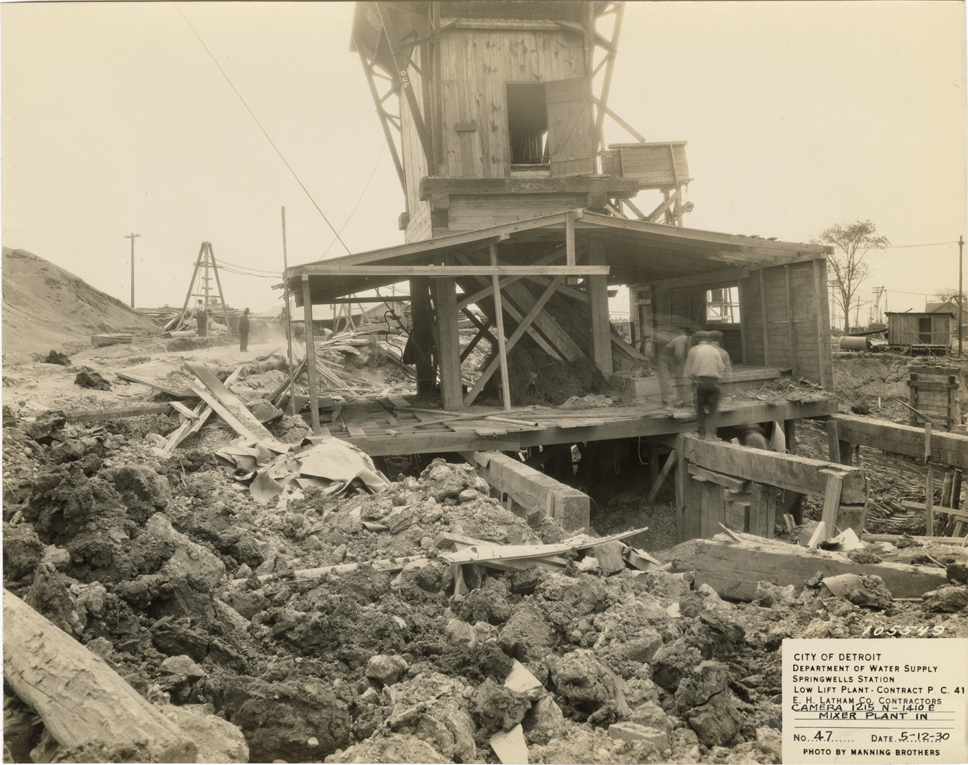 View of workers at mixer plant at low lift plant in the Springwells Station treatment plant during construction, Detroit water supply system. Printed on front: "City of Detroit. Department of Water Supply. Springwells Station. Low lift plant. Contract P.C. 41. E.C. Latham Co., contractors. Camera 1215N-1410E mixer plant in. No. 47. Date: 5-12-30. Photo by Manning Brothers."