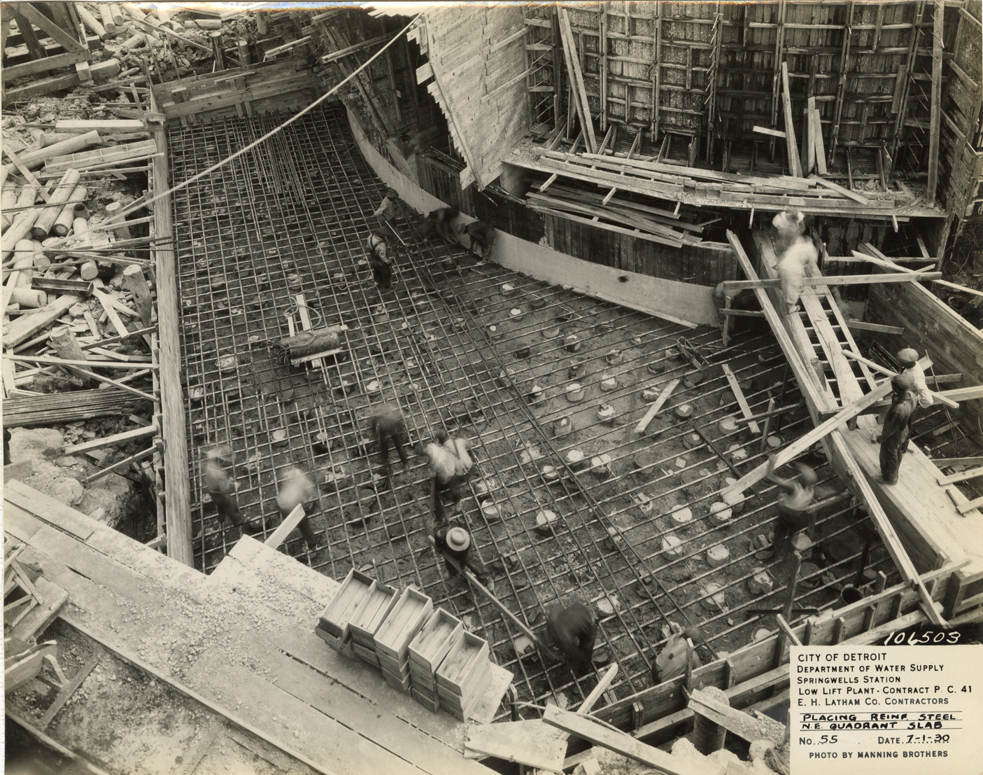 Overhead view of workers at low lift plant in the Springwells Station treatment plant during construction, Detroit water supply system. Printed on front: "City of Detroit. Department of Water Supply. Springwells Station. Low lift plant. Contract P.C. 41. E.C. Latham Co., contractors. Placing reinf. steel N.E. quadrant slab. No. 55. Date: 7-1-30. Photo by Manning Brothers."