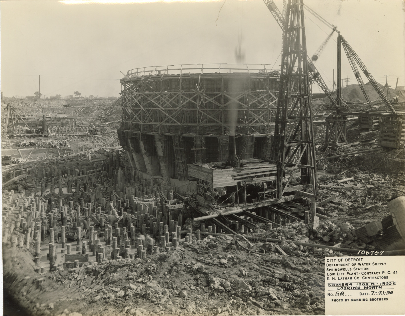 View of low lift plant in the Springwells Station treatment plant during construction, Detroit water supply system. Cranes on construction site. Printed on front: "City of Detroit. Department of Water Supply. Springwells Station. Low lift plant. Contract P.C. 41. E.C. Latham Co., contractors. Camera 1000N-1300E looking north. No. 58. Date: 7-21-30. Photo by Manning Brothers."